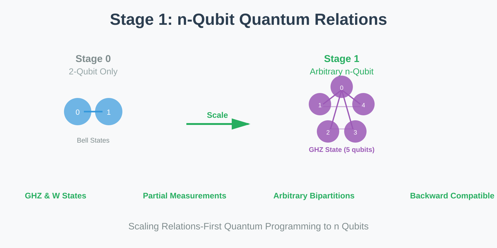 Stage 1: Scaling Relations-First Quantum Programming to n Qubits